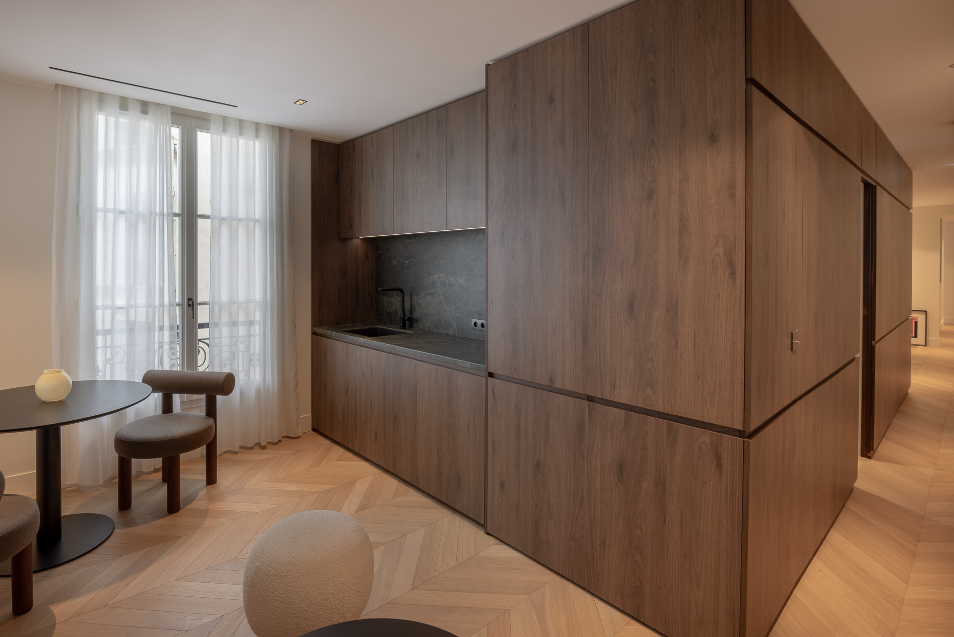 Un soin tout particulier a été apporté au traitement des plafonds, entièrement retravaillés pour révéler et sublimer les éléments haussmanniens existants, réinscrivant ainsi le lieu dans son histoire tout en lui offrant une lecture contemporaine.